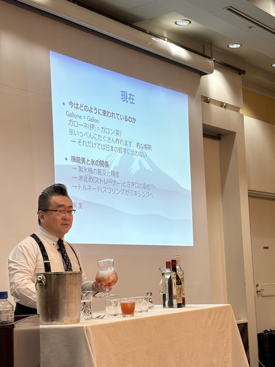 上野会長の長年に渡るバーテンダーとしての貴重なご経験をもとに、世界大会での経験談、海外のお客様への接客術、世界のカクテルのトレンド等のとても興味深い講話や、実演ではガローネを使用したカクテルの作成や氷のカッティングなどを中心にご講演いただきました。