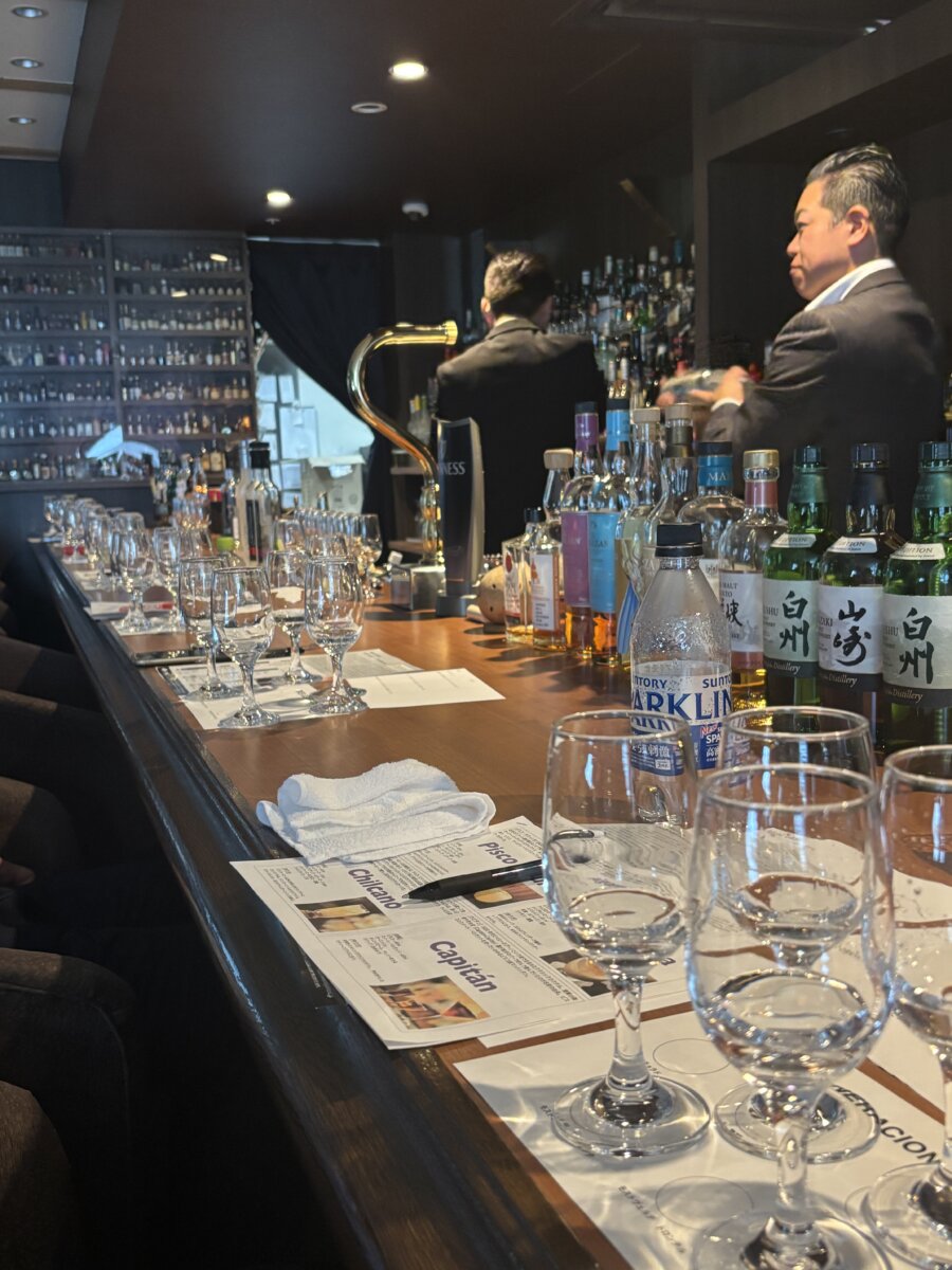 ご協賛を賜るリカーランドキムラ様のご厚意により、講師として Bar SuperNova の石井 豊様をお迎えし、ピスコセミナーを開催いたしました。冒頭では、ペルーの歩みとともにピスコの成り立ちを、映像を交えてわかりやすくご解説いただきました。続いて、5種類のピスコのテイスティングに加え、ピスコを用いたカクテルの試飲も行い、産地や原料による風味の違いを学ぶことができました。セミナー後も、各会員からの質問に丁寧にご対応くださり、終始活発な意見交換が行われる充実した時間となりました。