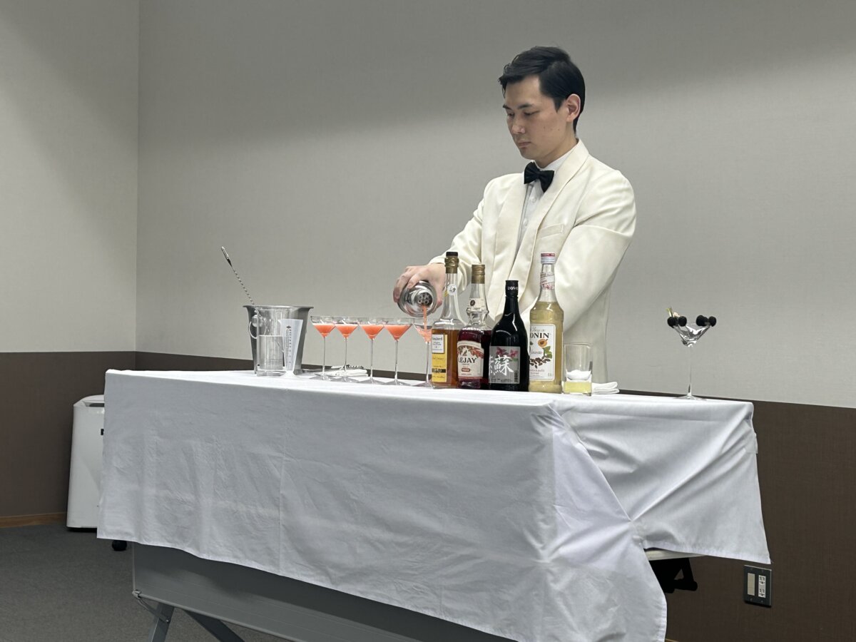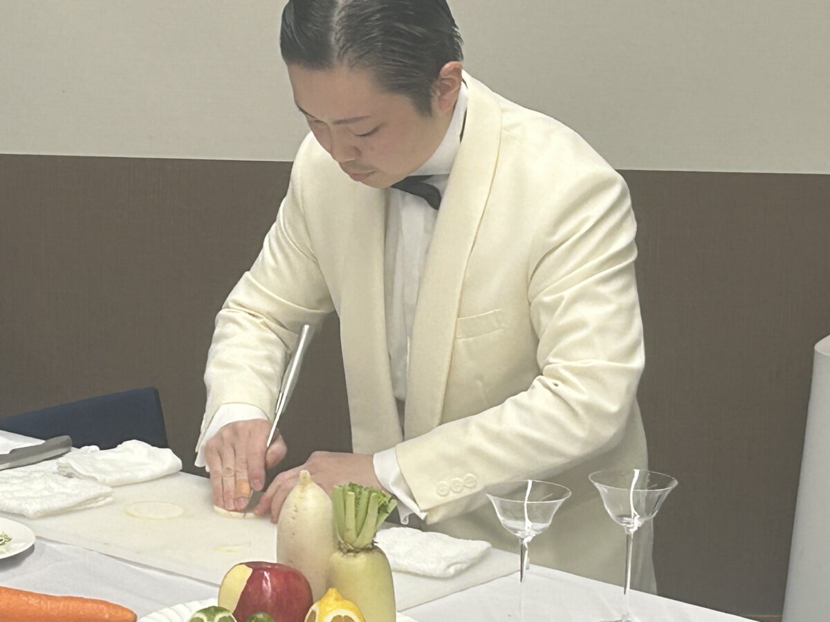 デコレーション部門を千葉支部長、創作部門を岡田選手、課題部門を塩谷選手が受持ち、試技をしながら、その動きの意味や注意点を解説していく構成で進められました。それぞれの部門で入場から退場まで時系列に沿ってパート分けをし、司会者と講師が質疑を交わしながら、細かい点までかなり緻密な解説が行われました。審査員(お客様)目線での意識の持ち方や日常でのトレーニング方法のアイデアなど、実用性が高く濃密な内容でした。