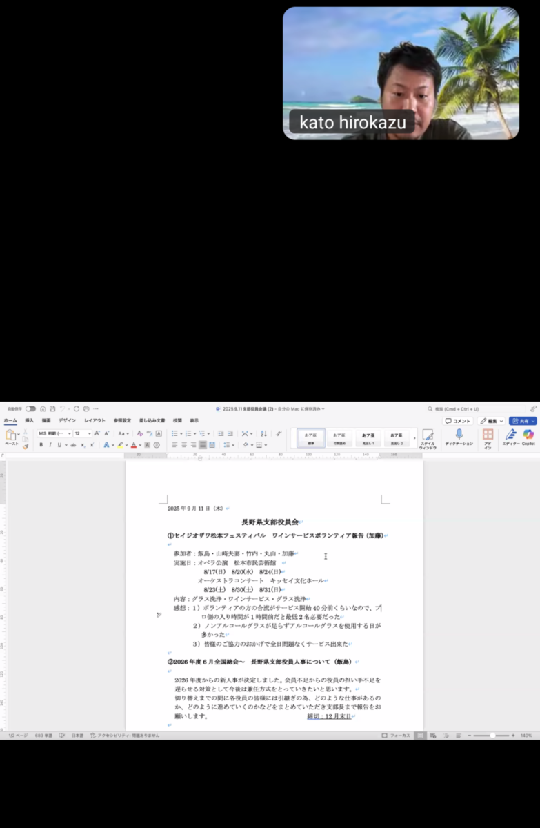 ①セイジオザワ松本フェスティバルでのワインサービスボランティアの活動内容の報告と反省点。②2026年度からの長野県支部役員人事について。新人事の決定、発表。切り替え時期までに引継ぎ内容をまとめて支部長に報告など、すべきことの摺り合わせ。③11月予定の秩父蒸留所見学会についての意見交換。ルートやタイムスケジュール等の確認。④今後の予定の告知報告と、その他各部署からの連絡。