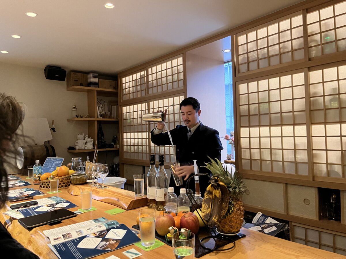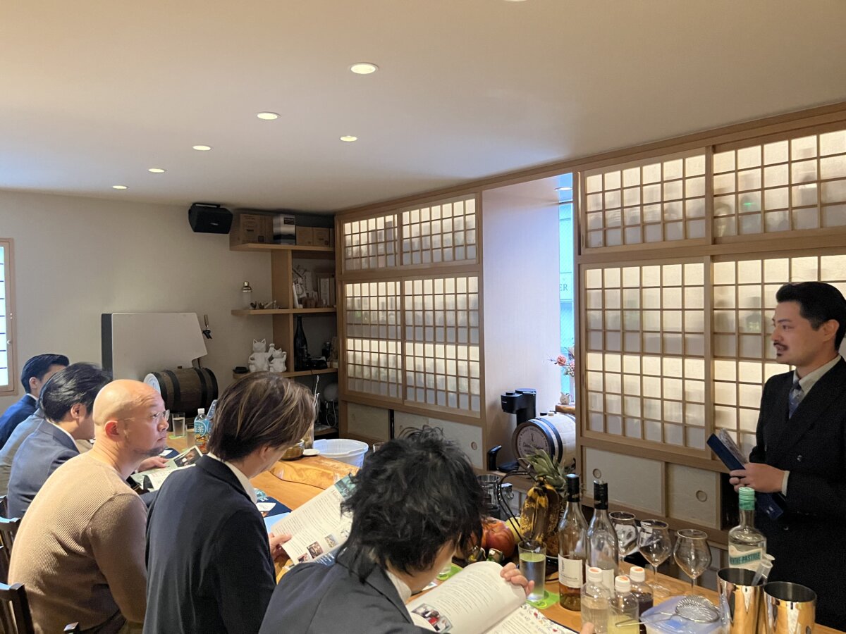 歴史や商品説明の後、峰岸氏によるカクテルコンペ優勝作品の実演、試飲、各種商品の試飲を行いました。
