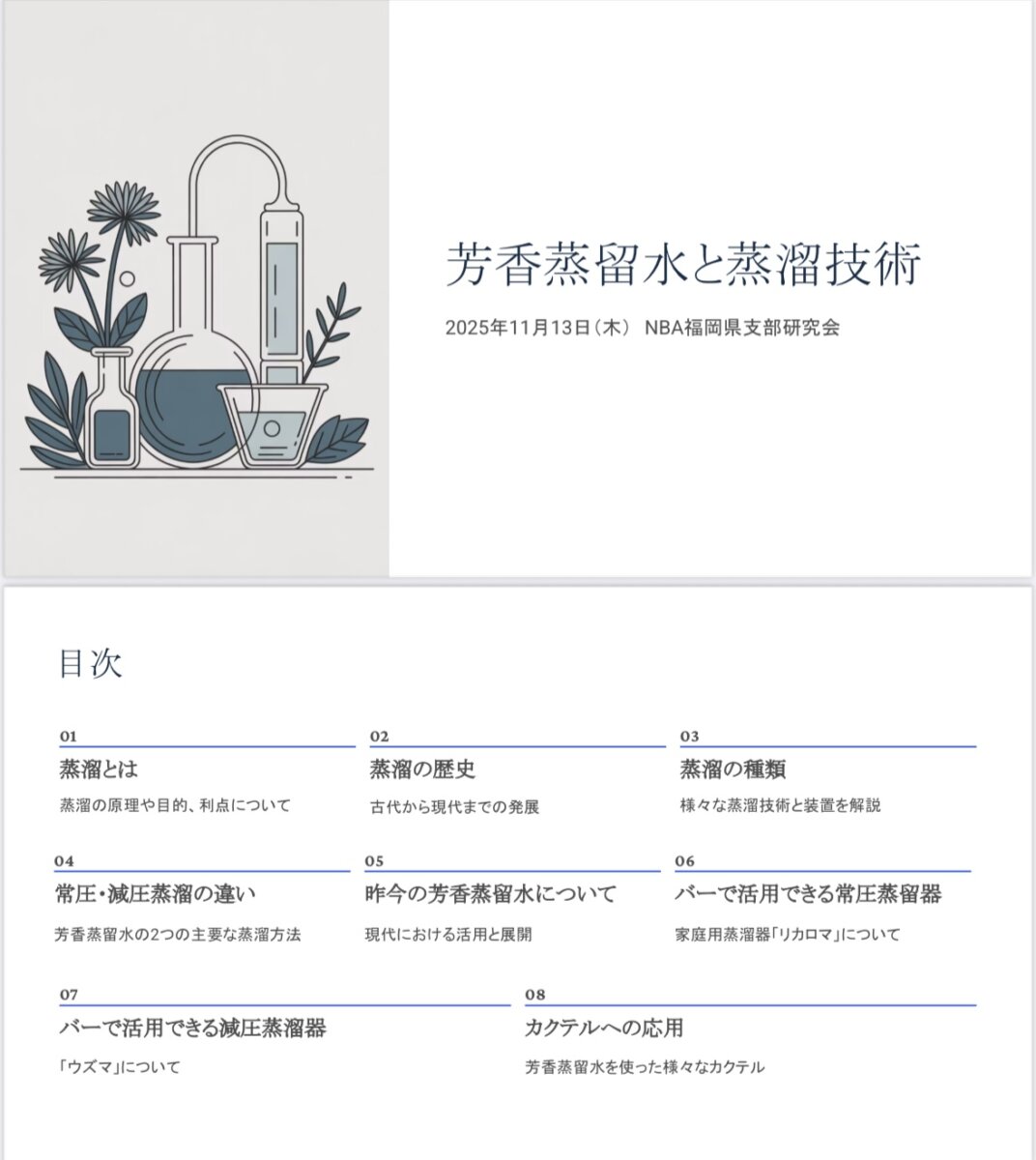 本研究会を通じて、芳香蒸留水がカクテルにおける新たな可能性を持つ素材であることを改めて実感いたしました。ご参加及びご協力いただいた皆様に心より御礼申し上げます。