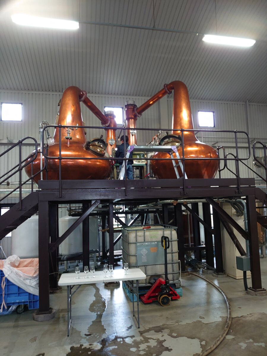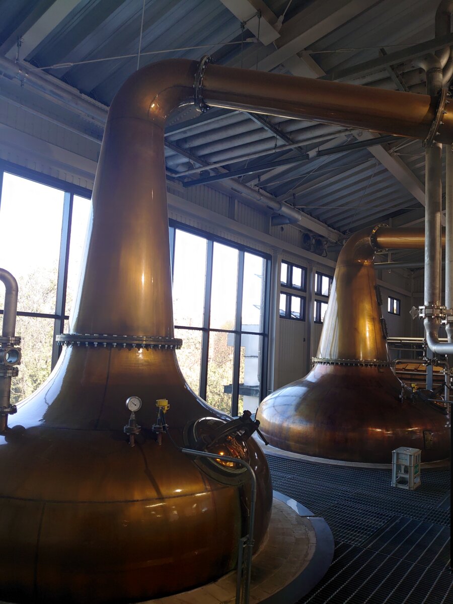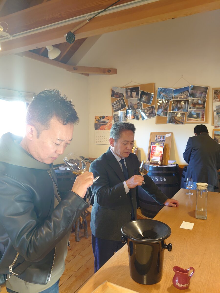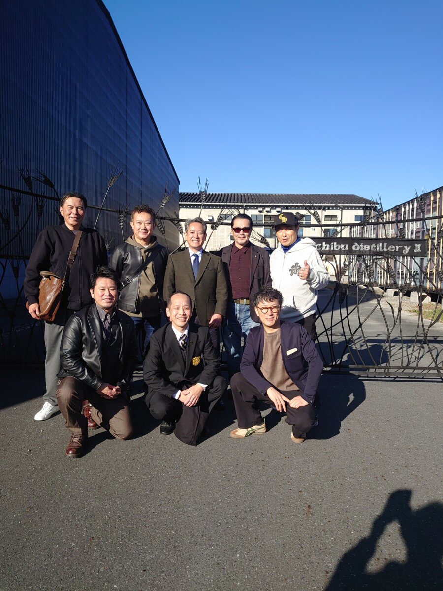 研修旅行として、長野県支部の会員で埼玉県秩父市にある「秩父蒸溜所」に行って来ました。所長の渡部様のご案内で先ずは第1蒸留所より見学。なかなか見る事の出来ないフロアモルティングルームや大麦麦芽の乾燥棟(キルン)、発酵槽や蒸留器、貯蔵庫など詳しい説明と共に見学させていただき、その後第2蒸溜所に移動。2019年に設立の第2蒸溜所は第1蒸溜所の5倍の生産能力を有し、近代化されたシステムが特徴的でした。第1蒸溜所と第2蒸溜所の違いを説明していただきながら第7貯蔵庫へ。こちらはラック式となっており、収納能力は約1万8000樽にも及び圧巻の風景でした。参加会員一同で門の前で記念撮影後、ゲストハウスで試飲会が行われ、通常ボトルに加え貴重な原酒も3種類や、リニューアルしたダブルディスティラリィーなどイチローズモルトづくしの大変貴重な試飲の数々でした。